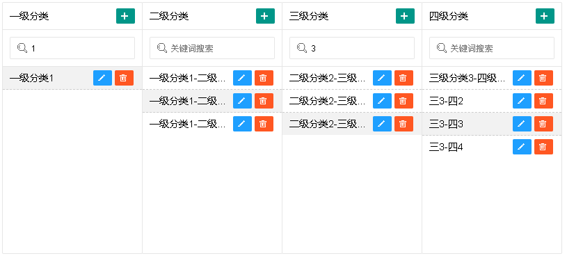 , title : ['一级分类', '二级分类', '三级分类', '四级分类'] // 自定义水平分类标题