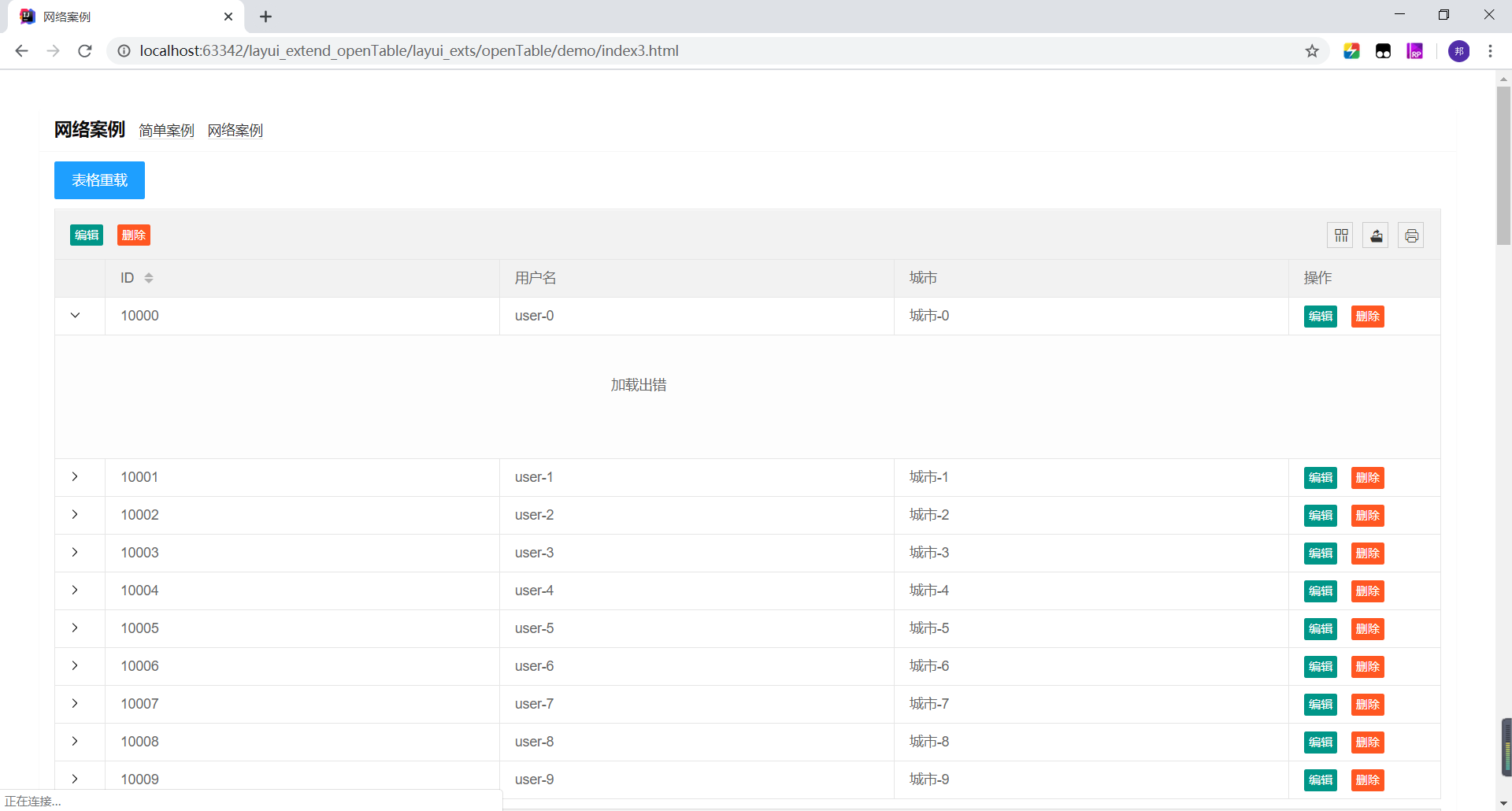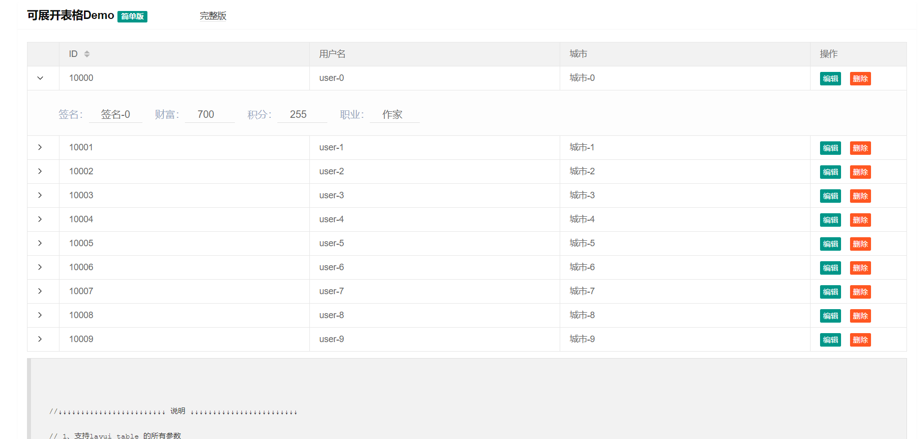 2、以上为简单案例,完整版支持展开列的修改(展开列支持layui select下拉控件)